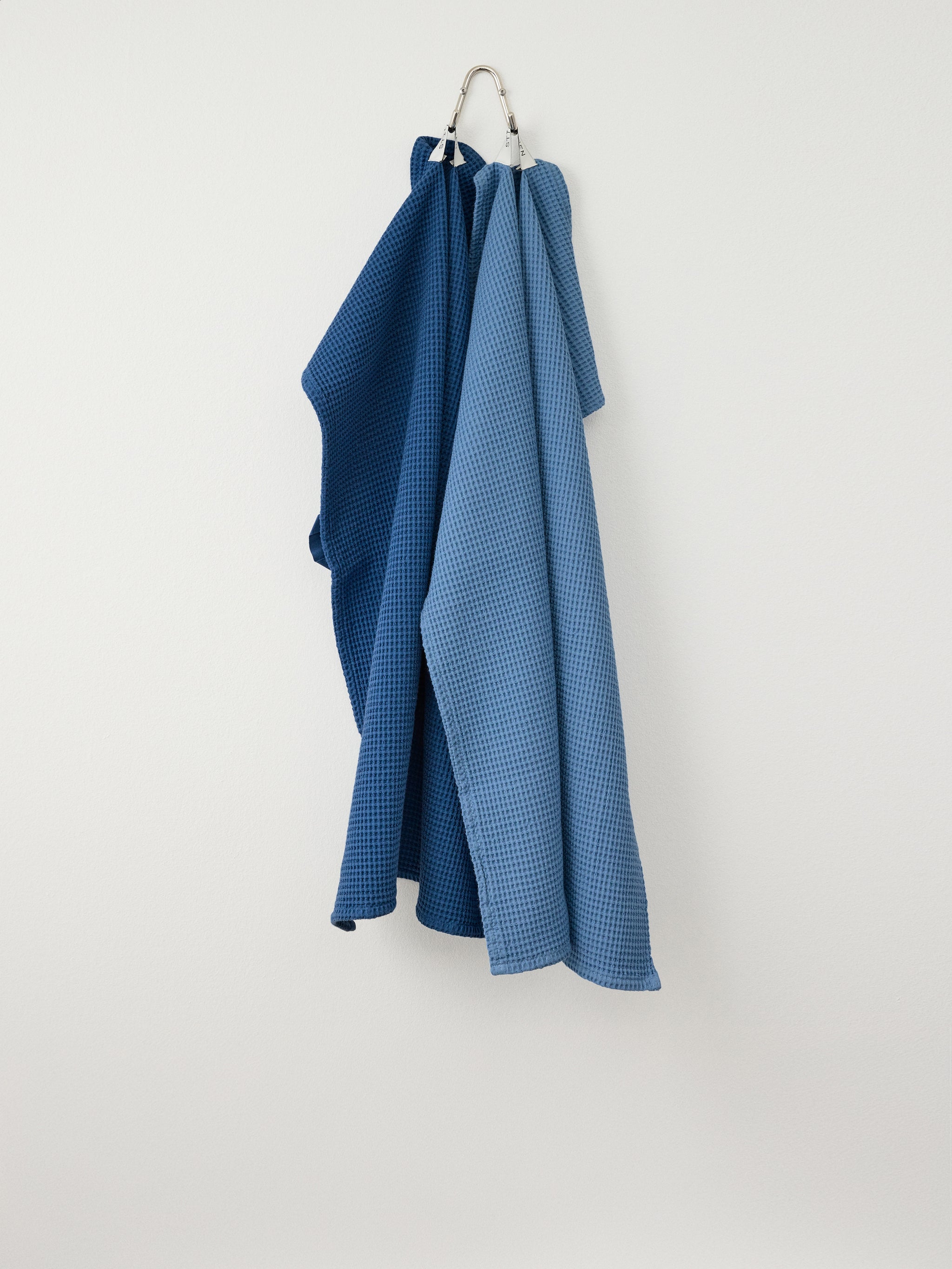 Our waffle tea towel is made from 100% organic cotton. It feels both light and substantial at the same time, making it a functional all-round towel that easily handles everything from glassware to pots and pans. The tea towel comes with hanging loops on two sides.